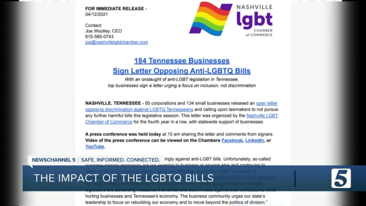 NASHVILLE, Tenn. (WTVF) — More than 180 businesses and corporations signed a letter to state lawmakers opposing LGBTQ-related legislation Monday. The Nashville LGBT Chamber released the letter urging lawmakers to stop the pursuit of 15 bills. The chamber is targeting bills specifying transgender athletes, students and rules involving bathrooms.
