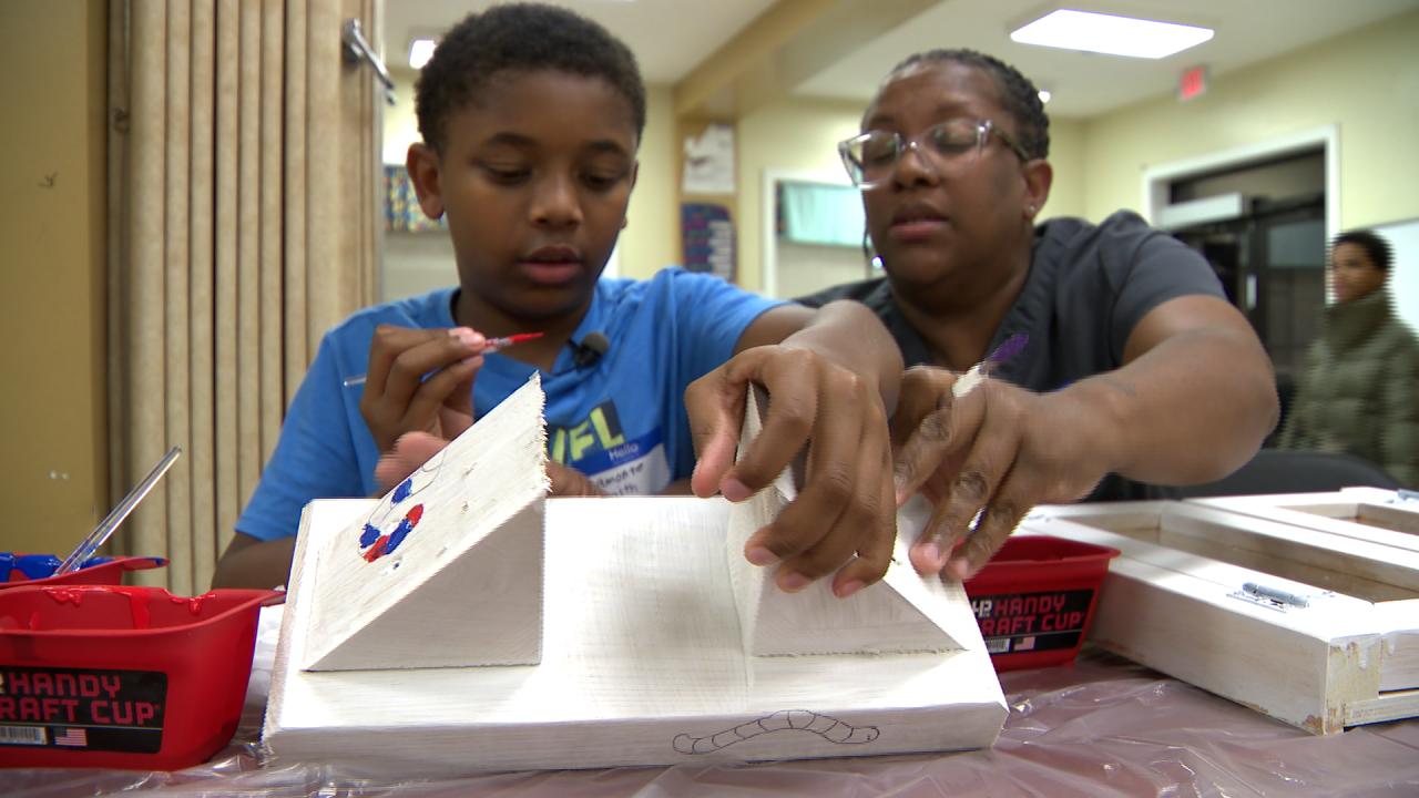 Mom Dorothea Parker sat with her 10-year-old son, Lamonte. The two dipped brushes in paint and decorated the boards in front of them. They were surrounded by other parents and children.