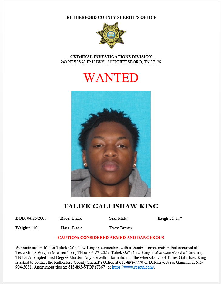 If you have information on the whereabouts of Taliek Gallishaw King, please contact the Rutherford County Sheriff’s Office at 615-898-7770 or Detective Jesse Gammel at 615-904-3051. Anonymous tips may be left at: 615-893-STOP (7867) or https://www.rcsotn.com/ [rcsotn.com].
