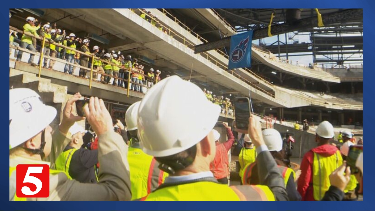 NASHVILLE, Tenn. (WTVF) — Construction crews working on the Tennessee Titans' new Nissan Stadium reached a major milestone Friday morning as they celebrated the "topping out" ceremony, marking the completion of the steel structure for the 60,000-seat venue.