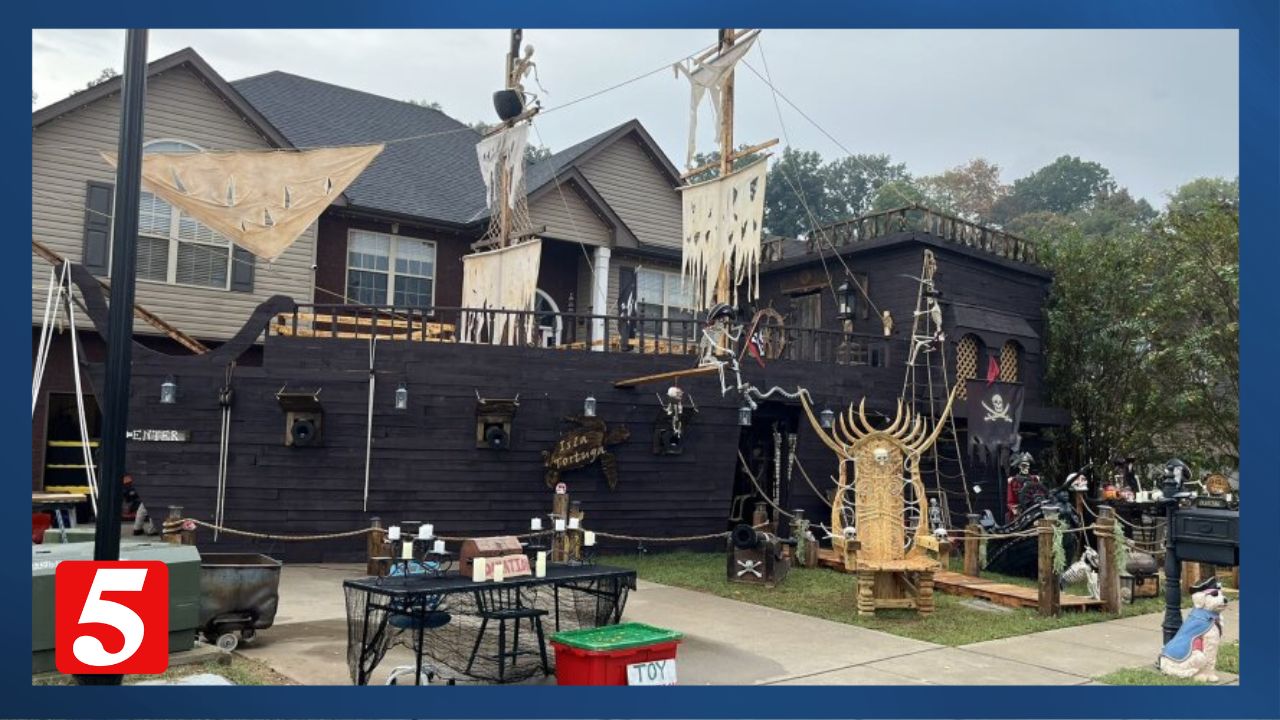 CLARKSVILLE, Tenn. (WTVF) — An Army combat veteran in Clarksville has transformed his front yard into a Caribbean adventure, building a life-size pirate ship by hand to give families a free Halloween experience they'll never forget.