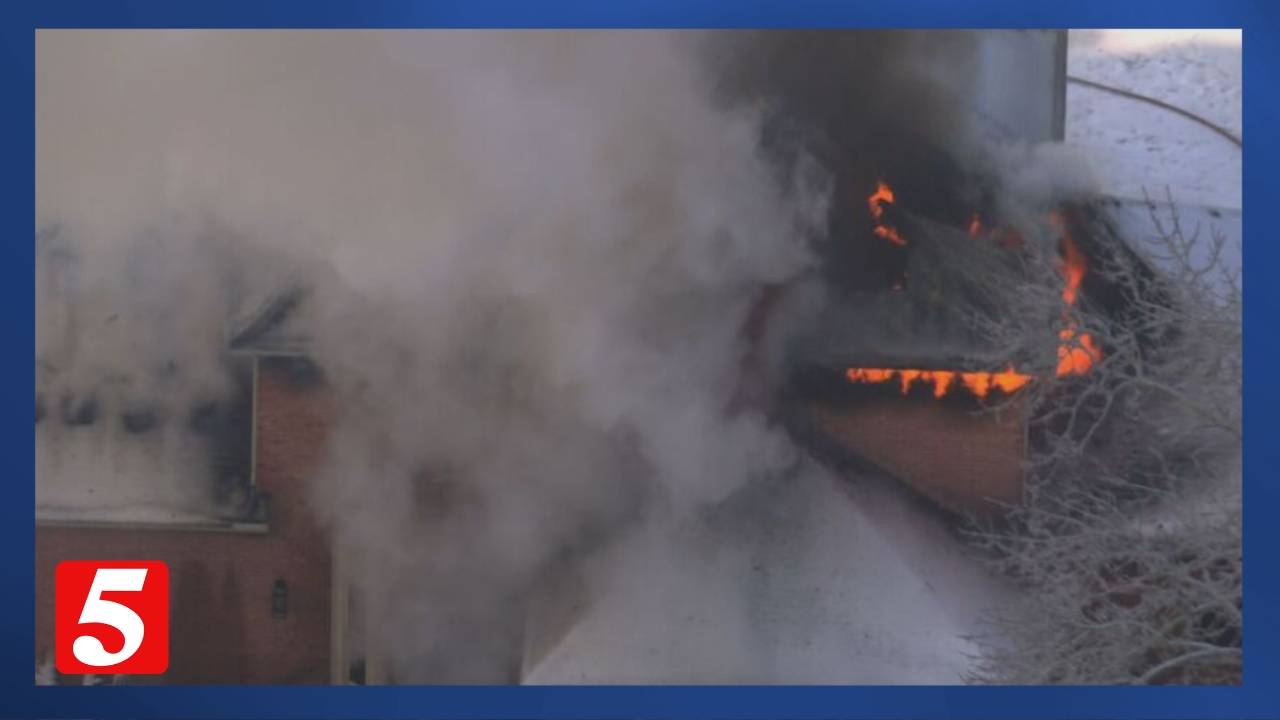FRANKLIN, Tenn. (WTVF) — A quick-thinking neighbor's call for help brought multiple fire departments to battle a house fire in Franklin Monday morning, as crews navigated icy conditions to respond to the blaze on Timberline Drive near Snead Road.