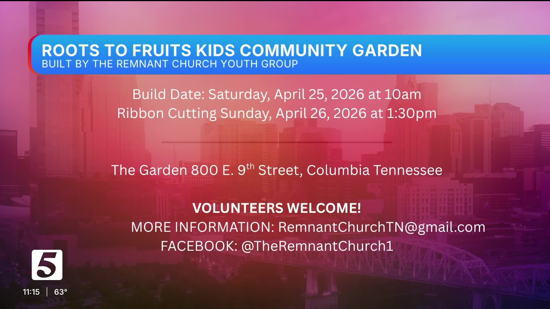 The garden will be located on a vacant lot owned by “The Garden” Community Event Space at 800 East 9th Street in Columbia, Tennessee. On April 24–25, 2026, The Remnant Church’s youth ministry will lead youth volunteers from Williamson and Maury counties will transform the space by building raised beds and planting nutrient-dense crops, including collard greens, tomatoes, cucumbers, and berries.