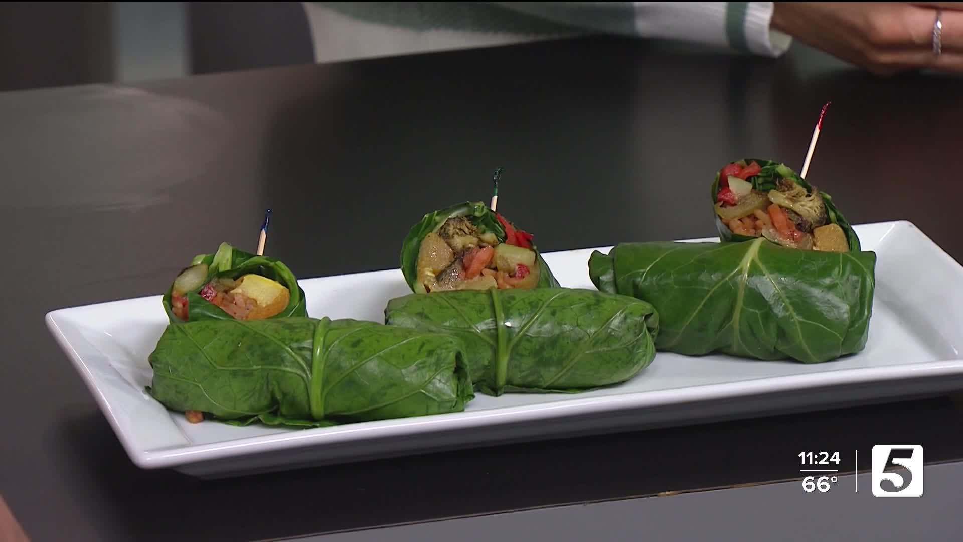 10. Take individual collard green leaf and place some of the roasted vegetables in the center and fold and roll.