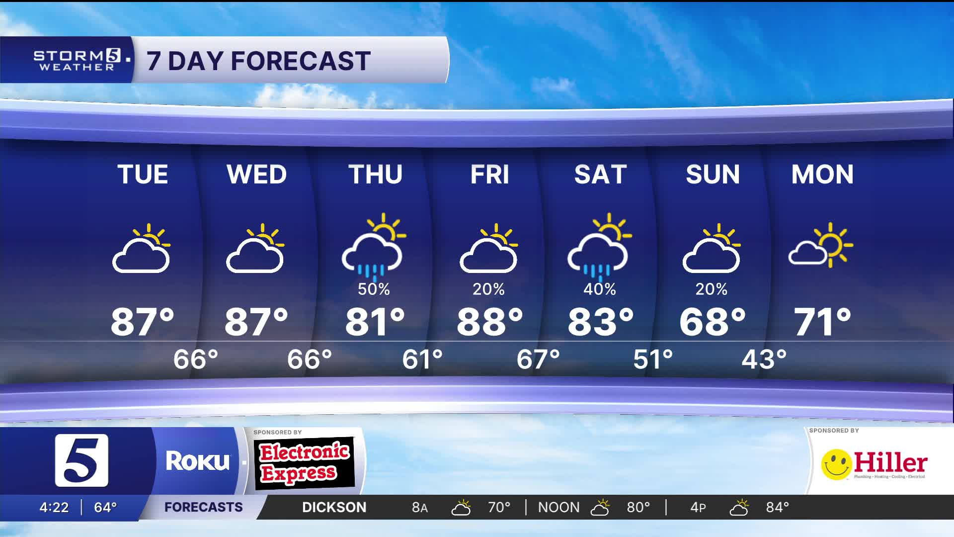 Tonight: Mostly Clear then Partly Cloudy |Low: 63| S 5-10