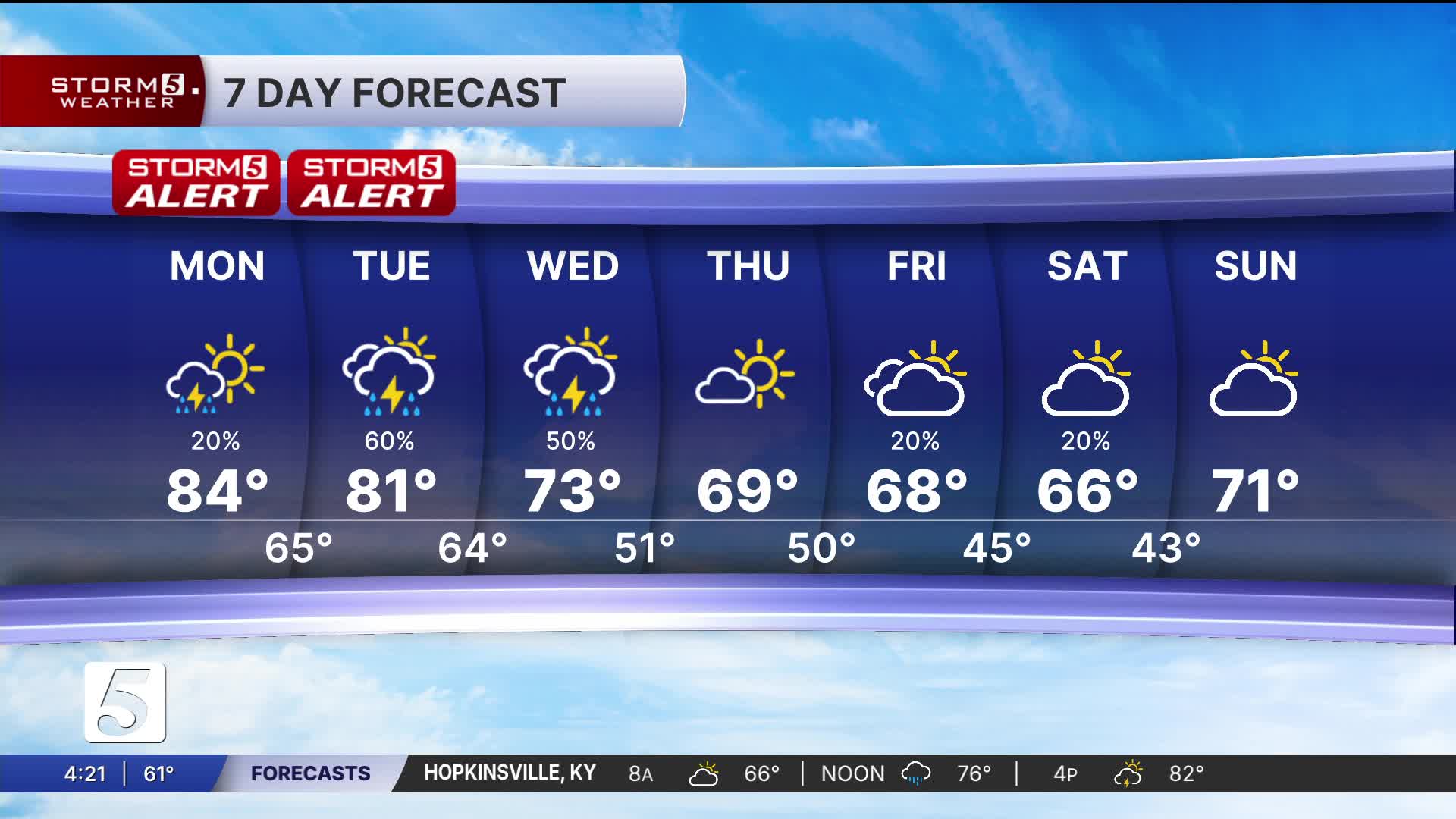 Today: Pt. Cloudy, 40% Shower & Storm Ch., Higher Chances to the West/Northwest Today |High: 84| S 15-20, Gusts: 20 mph