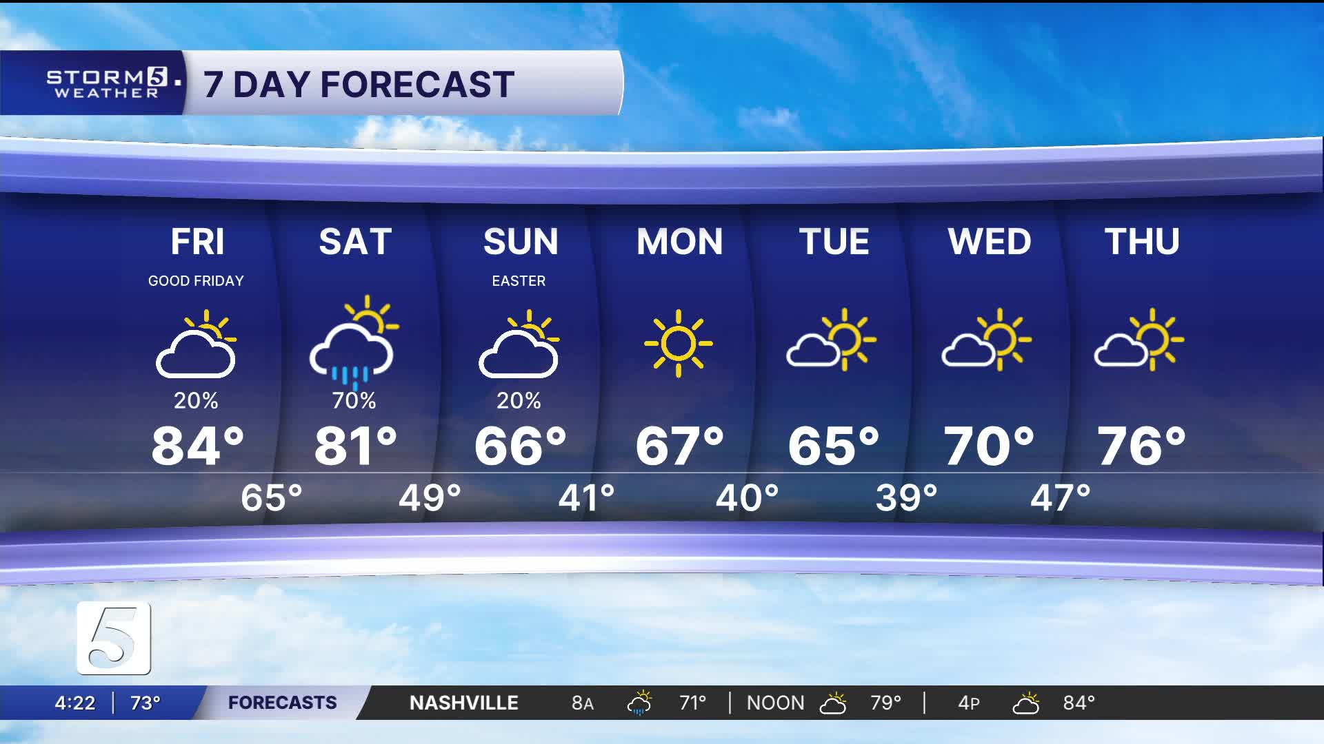 Easter: Becoming Mo. Sunny, Shower Chance Early East| High: 66| NW-5