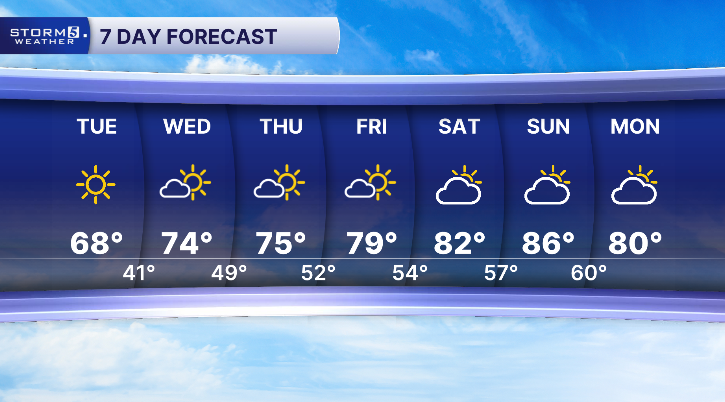 Wednesday morning lows will drop back into the 30s to low 40s. However, winds will shift out of the south by the afternoon, leading to highs in the 70s. A warming trend will continue through the weekend, with highs peaking Sunday in the mid to upper 80s.