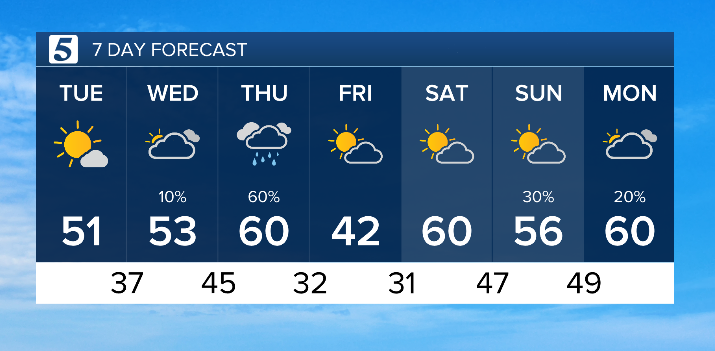 Friday turns colder, but we rebound nicely for the weekend, with highs returning to the upper 50s.