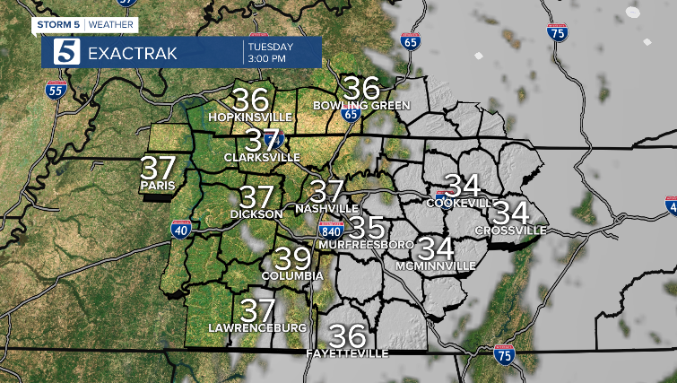 Today: Rain Moves Out, Cloudy Afternoon, Clear Evening |High: 37| NW 5-15 Tonight: Iso. Shower, Very Cold |Low: 30| NE 5-10
