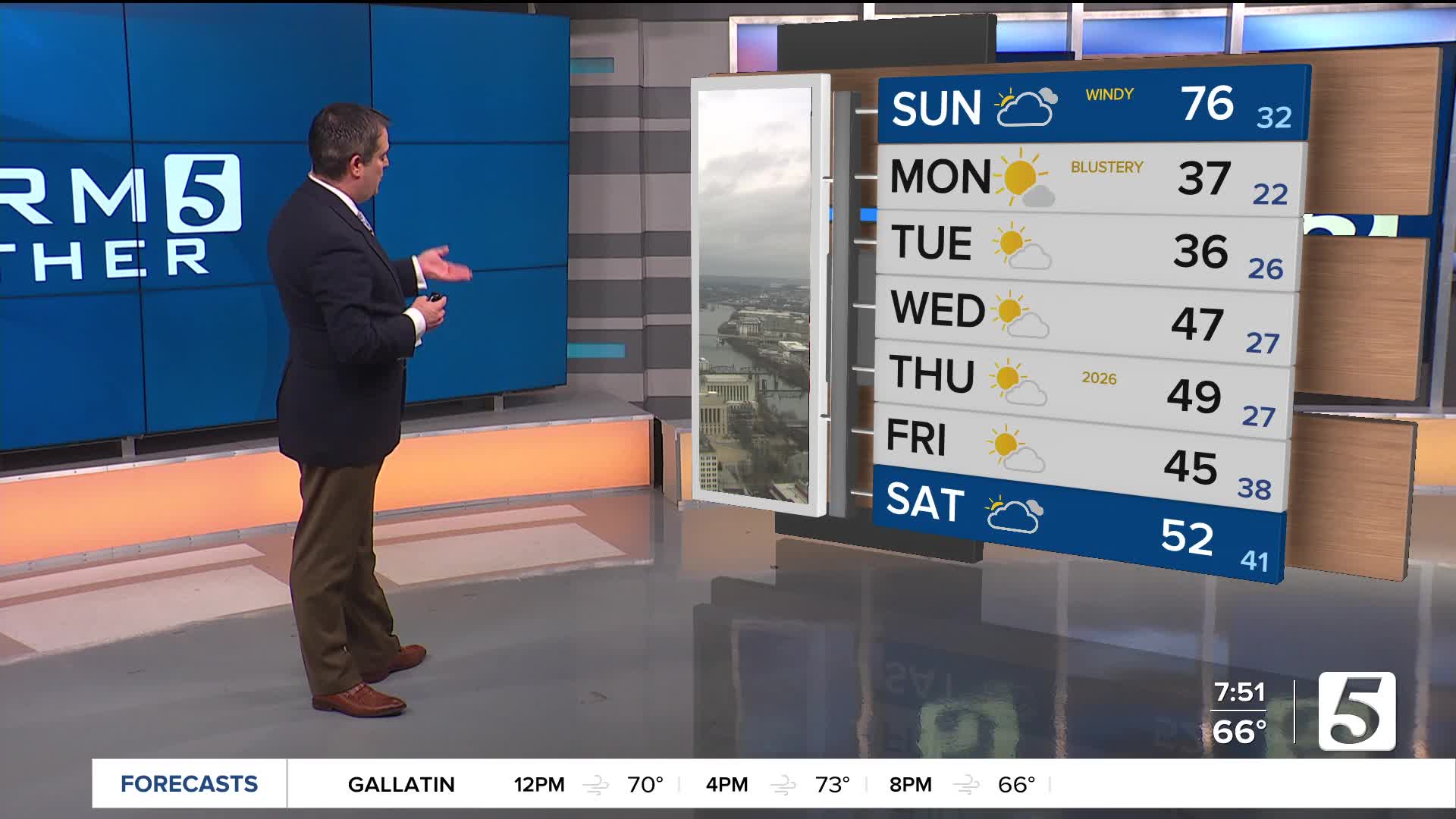 Monday: Becoming Sunny, Blustery | High: 37 | WNW 15-20