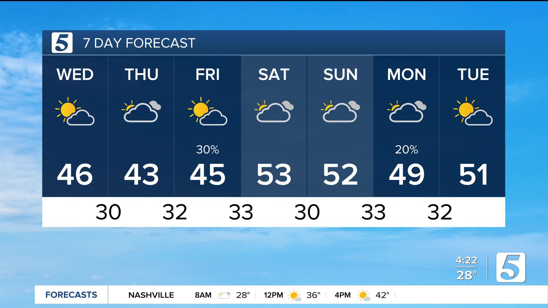 Today: Clouds decrease |High: 46| Light