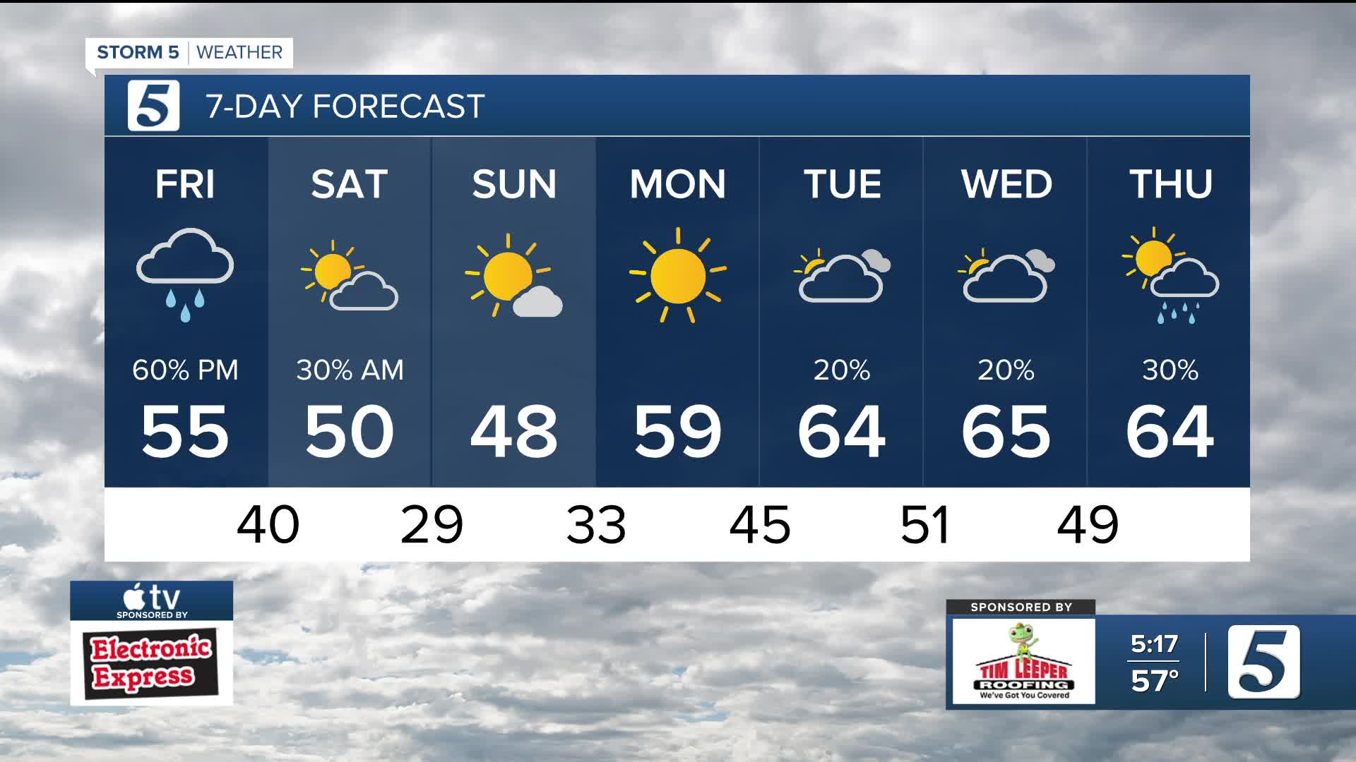 Tomorrow: Cloudy start with afternoon/evening rain showers |High: 55| SW -5