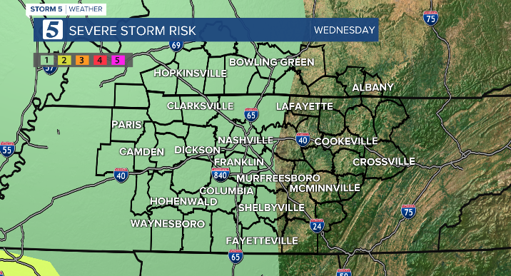 Showers will arrive by Wednesday morning, with a few storms possible late Wednesday night. The Storm Prediction Center has a level 1 of 5 (marginal risk). Main concern damaging wind gusts.
