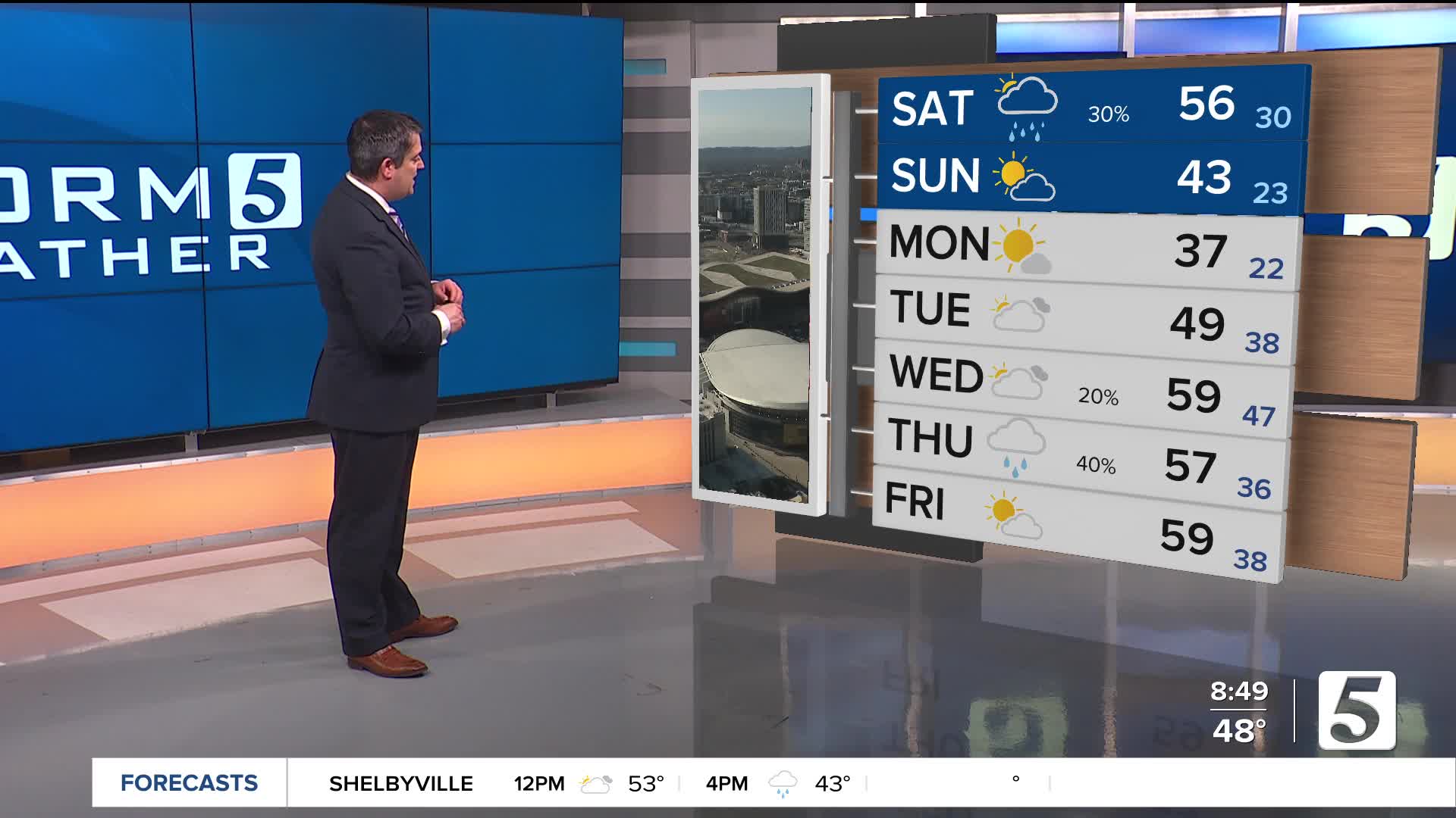 Sunday: Partly Cloudy & Blustery | High: 43 | NW 10-15, Gust 25mph+