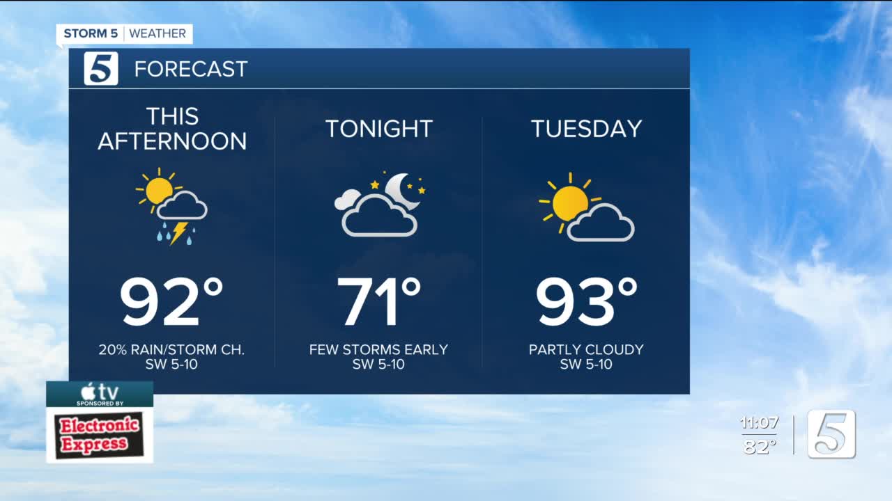 Tomorrow: P. Cloudy, Stray Storm Poss. |High: 93| SW 5-10