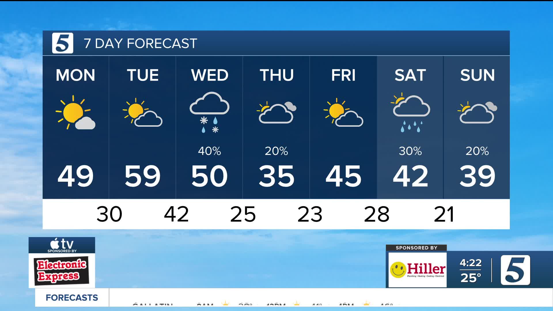 Sunny Start to the Week, Showers May End With Snow Showers Wed.