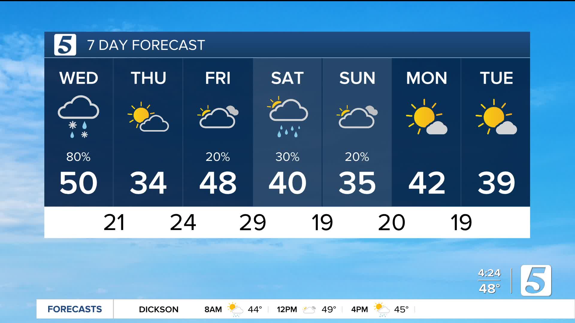 Today: Cloudy, Area Sowers |High: 50, Falling PM|W 5-10