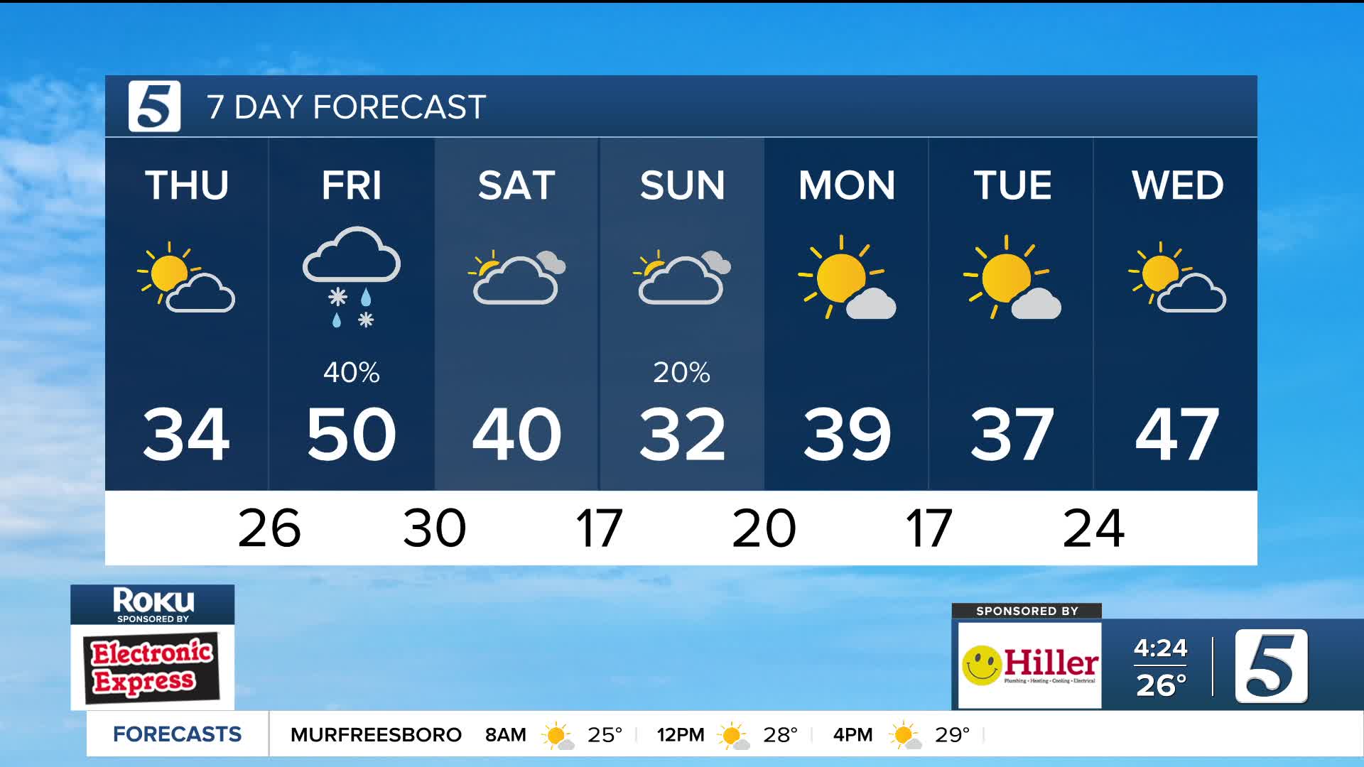 Friday night into Saturday morning, rain will move in, and as temperatures drop, precipitation will transition to wet snow. This looks to be a low-impact event, with accumulations anticipated to be less than an inch across the plateau. Locations along the KY/TN state line could see a light dusting up to 0.25 inches.
