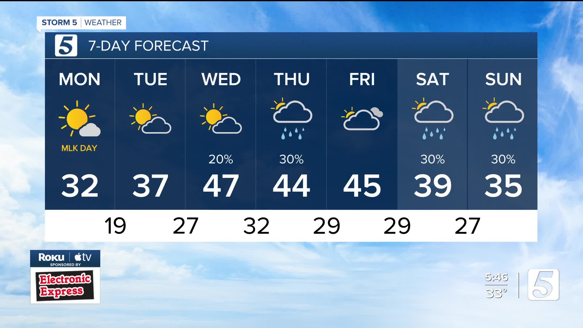 MLK Day: Mostly Sunny to Partly Cloudy w/ Below Avg. Temps | High: 32 | NW 5-15
