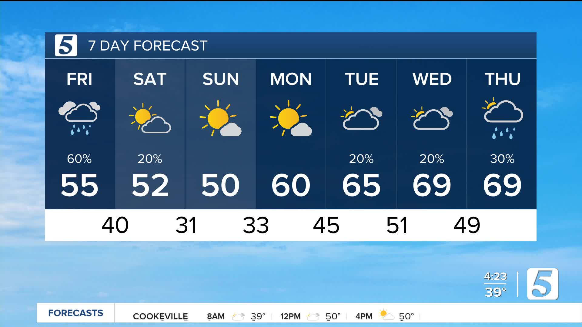 A few showers could linger into Saturday morning, mainly over the Plateau, before skies begin to clear from west to east during the afternoon.