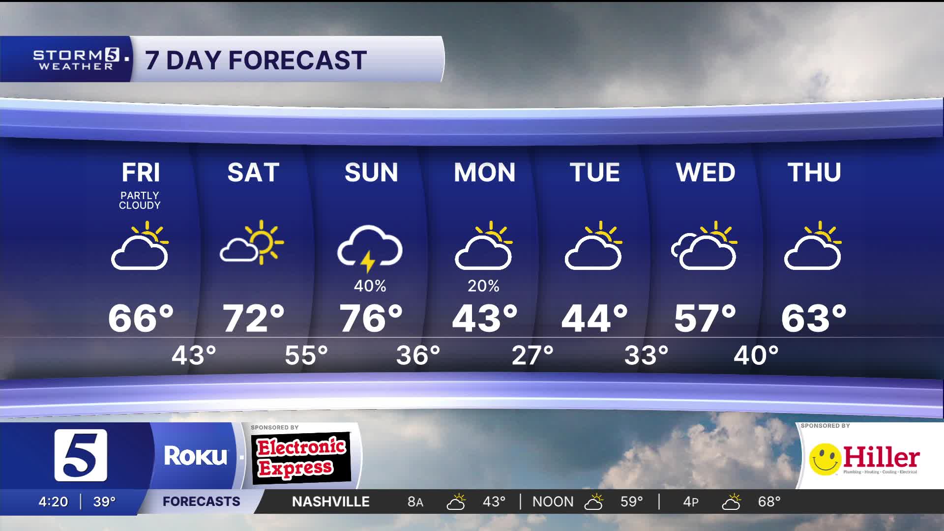 Sunday will be very windy. To start, winds will be out of the south, warming highs into the mid to upper 70s. Overnight, a cold front will move across Middle Tennessee and southern Kentucky. Some storms could be strong to severe.