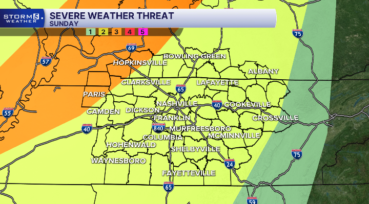 The main concern continues to be damaging wind gusts, with the highest concern in the northwest. That is why the Storm Prediction Center (SPC) has issued an Enhanced Risk (3 out of 5), meaning we will be watching for the potential for numerous severe storms. The rest of Middle Tennessee and southern Kentucky are under a Slight Risk (2 out of 5), meaning we will be watching for the potential for scattered severe storms.