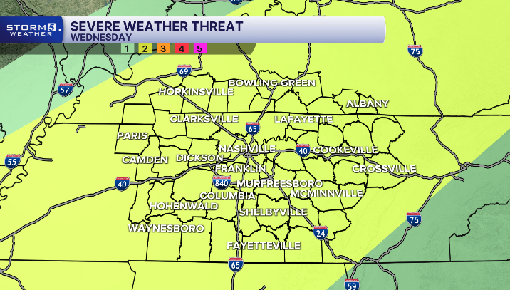 A disturbance will move in from our southwest, prompting some showers and thunderstorms. The severe threat is low, but not zero. Locations in Wayne, Lawrence, and Giles counties have a slightly higher chance for strong storms. Main concerns include damaging wind gusts and small hail.
