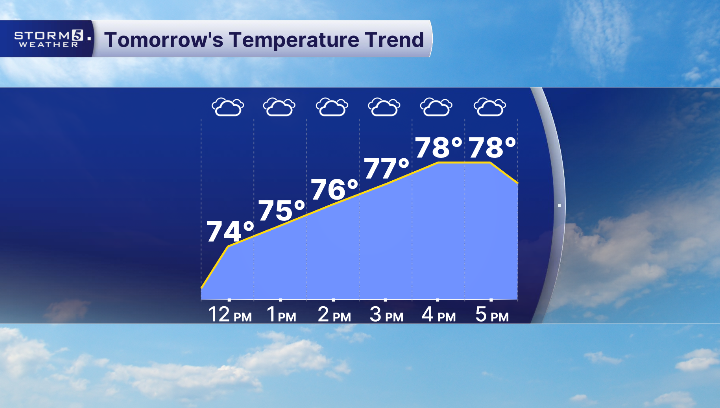 A warm front is lifting northward, allowing temperatures to soar back into the mid-70s.