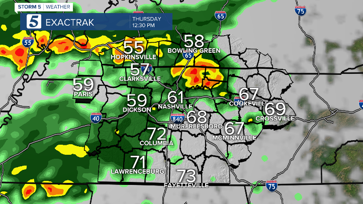 Showers and a few thunderstorms will move in from the late morning through the late afternoon, with the heaviest and most persistent activity expected north of I-40.