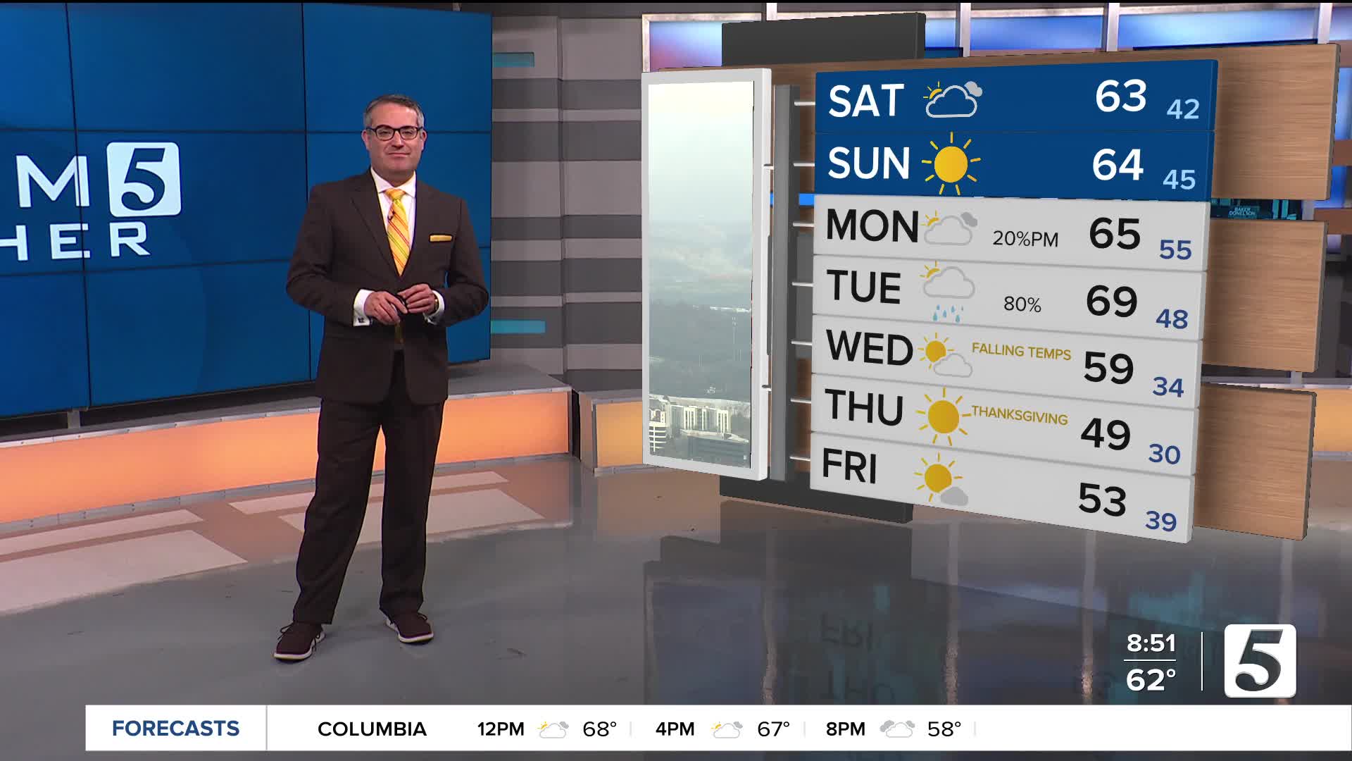 Be prepared for a strong cold front that'll arrive later into the work week. It'll bring heavy rain throughout Tuesday before causing highs to fall close to 50 for Thanksgiving.