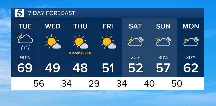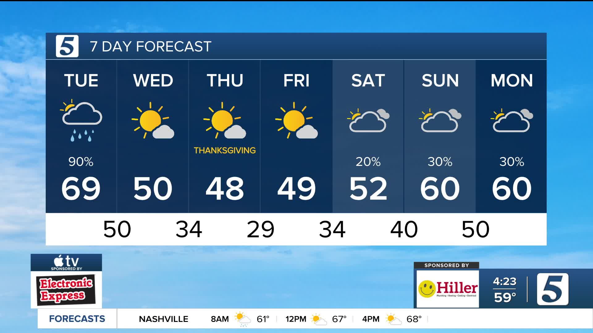 Thanksgiving looks beautiful but cold across the Mid-South. Temperatures will start in the 30s that morning and only reach the mid to upper 40s by the afternoon.