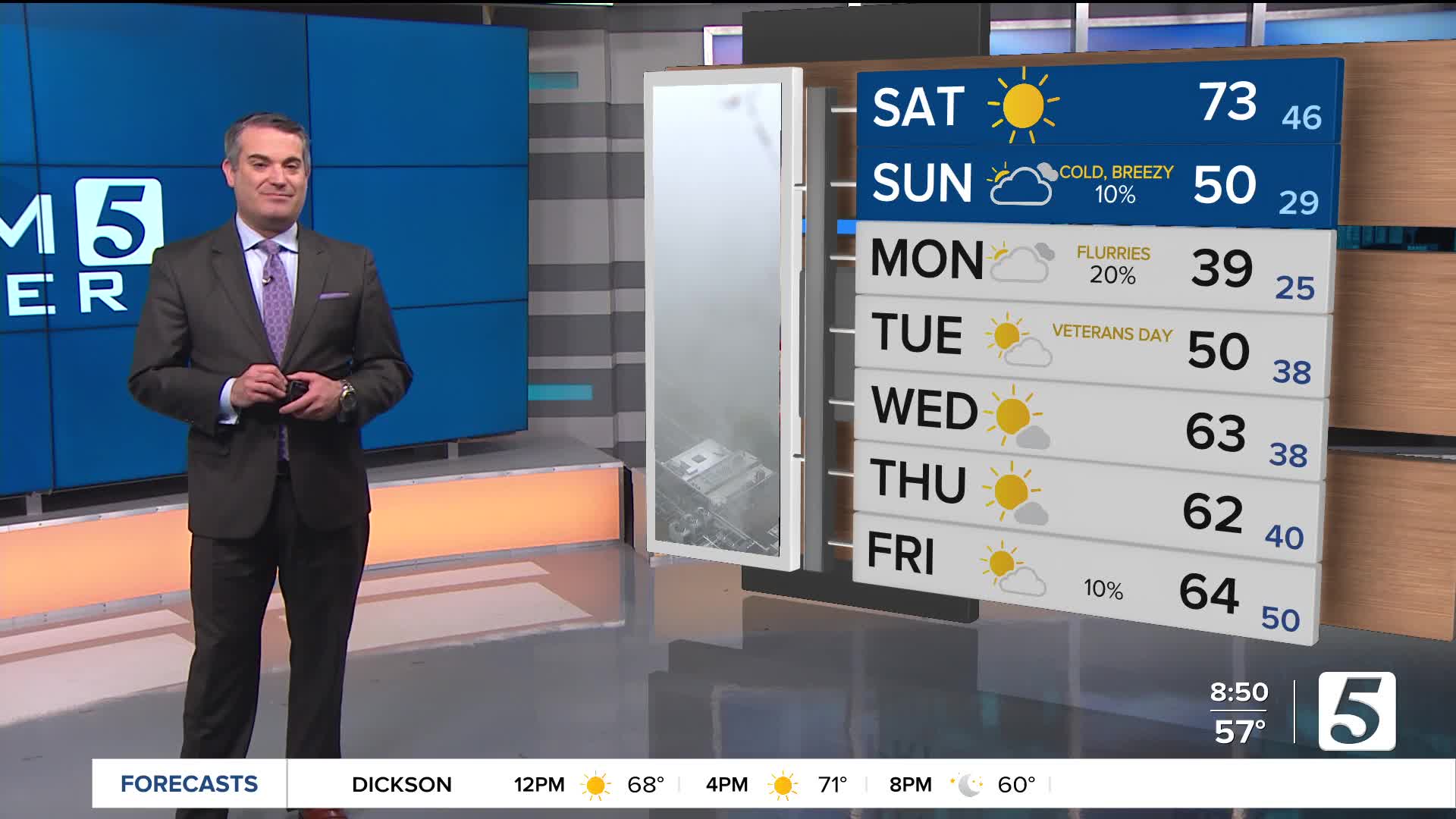 Sunday: Mostly Cloudy, Falling Temperatures | High: 50 (6am) 46 (2pm) | NW 10-15