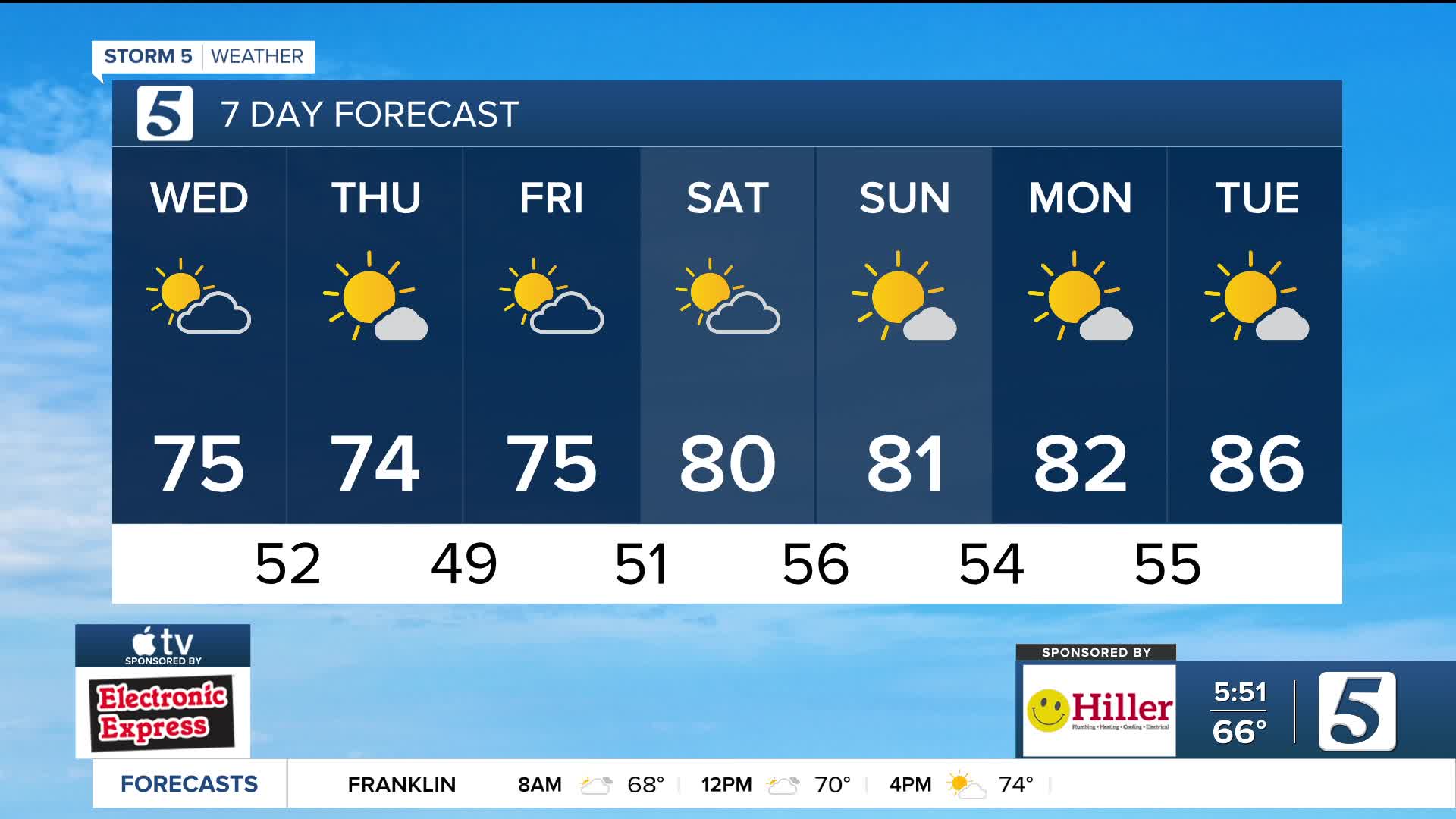 This Afternoon: Decreasing Clouds |High: 75| N 10-15