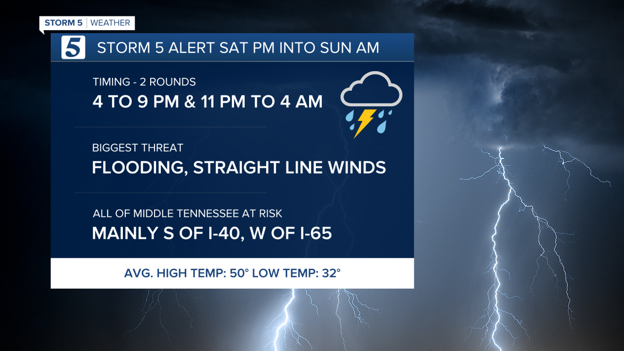 Storm5Alert in place beginning tomorrow afternoon through early Sunday morning. Two rounds of rain will bring the chance for isolated severe storms across Middle Tennessee.