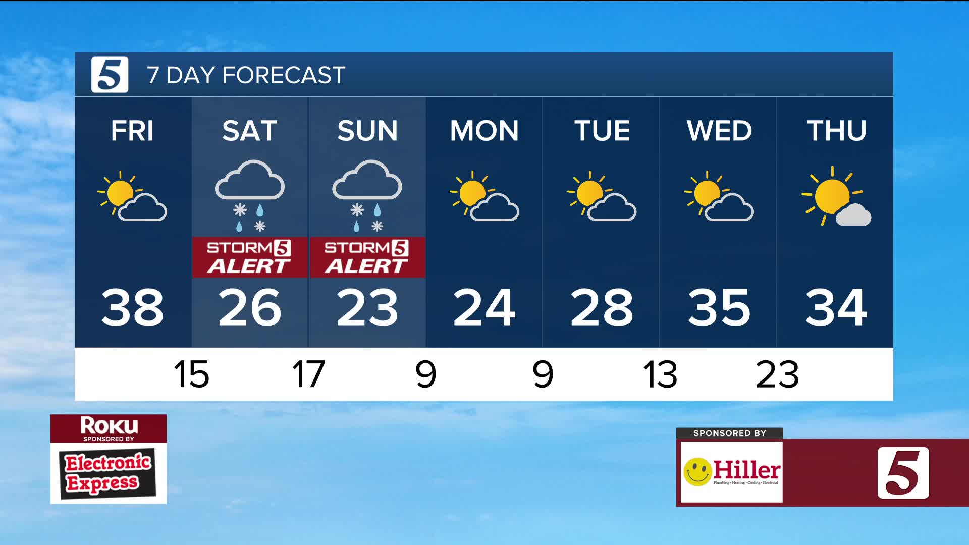 After a dry Friday, winter weather moves into the Mid-South late tonight. The current forecast track of the low pressure is expected to bring us snow, freezing rain, sleet and a cold rain to Middle TN and South Central Kentucky this weekend. The weather alerts begin at midnight tonight.