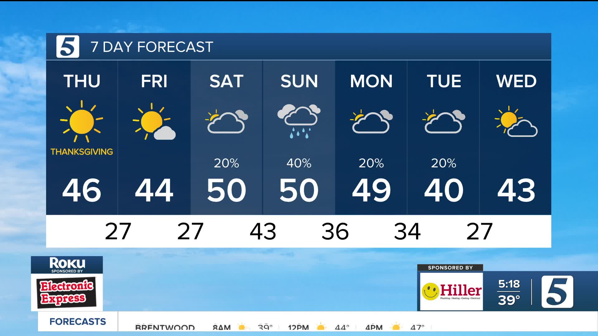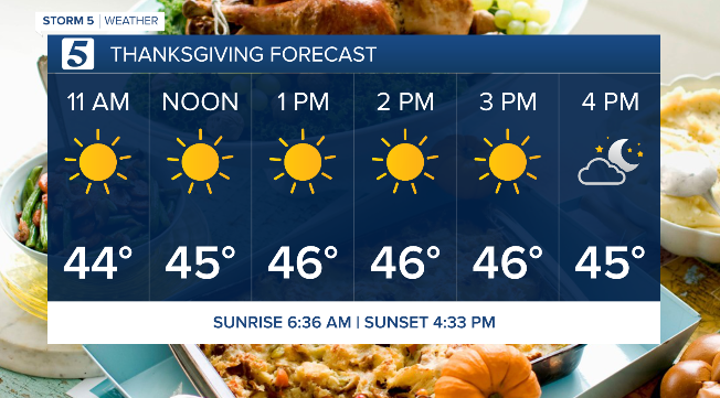 Thanksgiving: Becoming Sunny, Cold | High: 46 | NW 5-10
